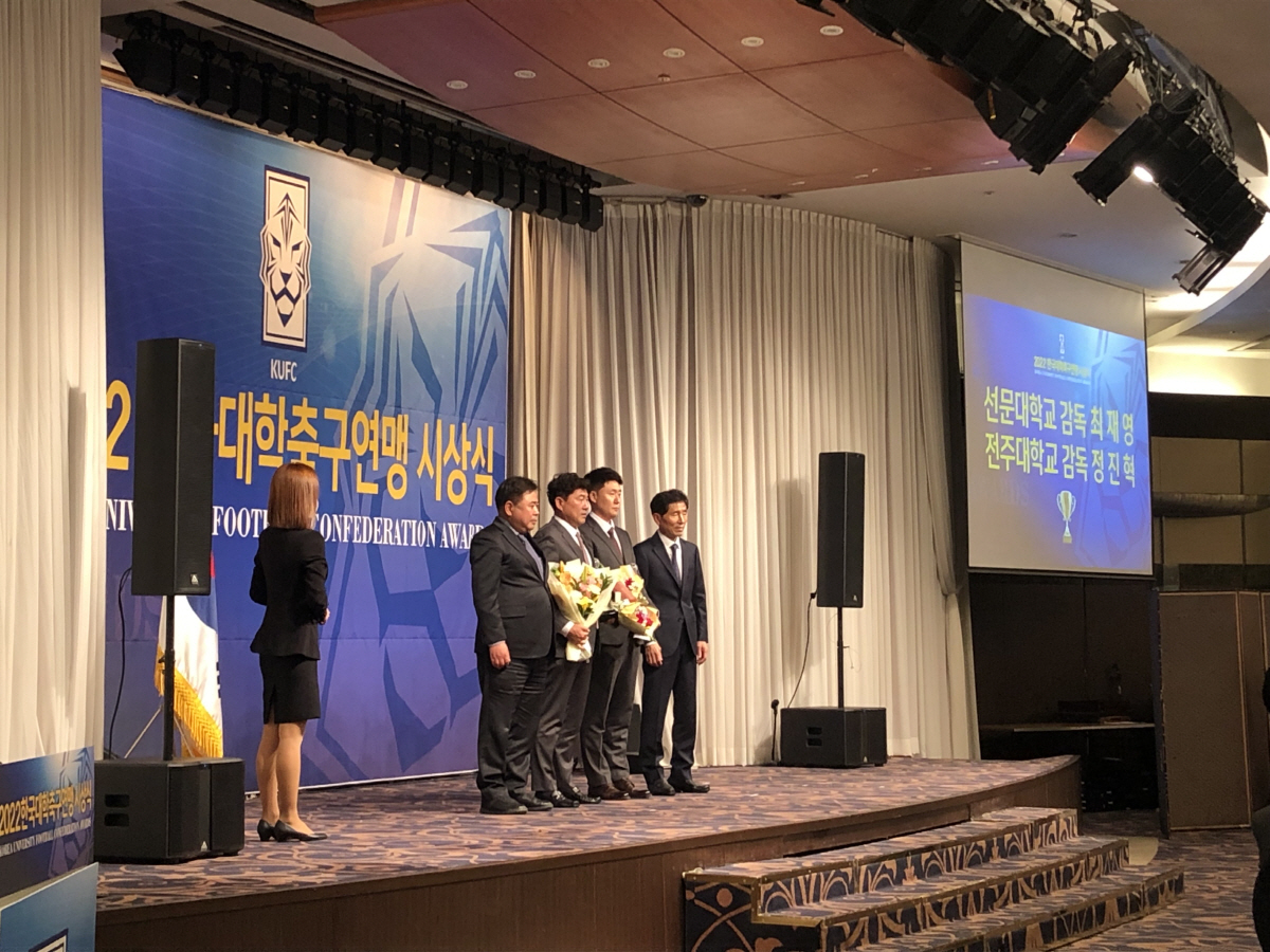 [스포츠조선 김가을 기자]최재영 선문대 감독과 정진혁 전주대 감독이 최우수 감독상을 공동 수상했다. 한국대학축구연맹은 7일 서울 청담동 호텔리베라에서 2022년 한국대학축구연맹 시상식을 개최했다. 연맹은 한 해 동안 대학축구 발전, 좋은 성적을 거두기 위해 애쓴 모두를 격려하는 자리를 만들었다. 올 한 해 그라운드 위에서 선의의 경쟁을 펼쳤던 감독과 선수들이 모여 서로를 응원했다. 동시에 다음 시즌 치열한 대결을 예고했다.
