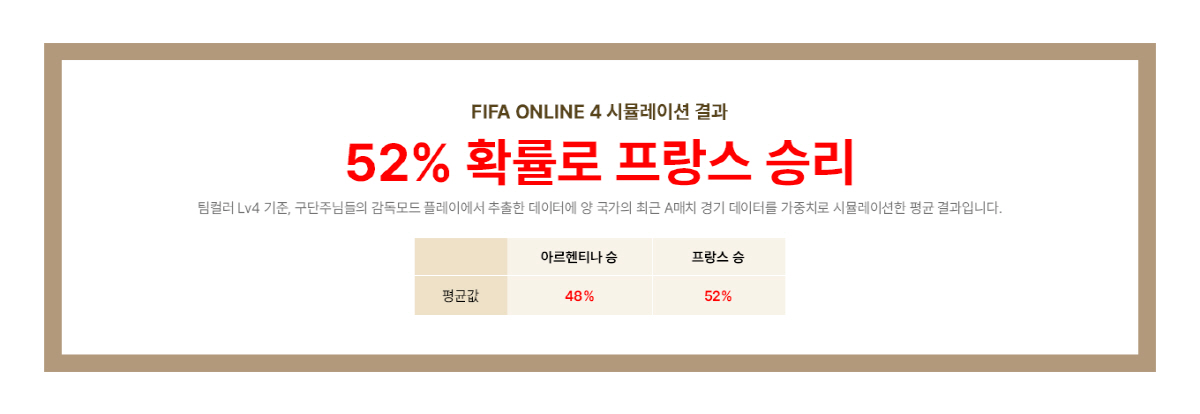 'FIFA 온라인 4'로 대결을 펼쳐봤을 때 프랑스의 우승 확률이 52%로, 아르헨티나의 48%에 미세하게 우위에 있는 것으로 나타났다.