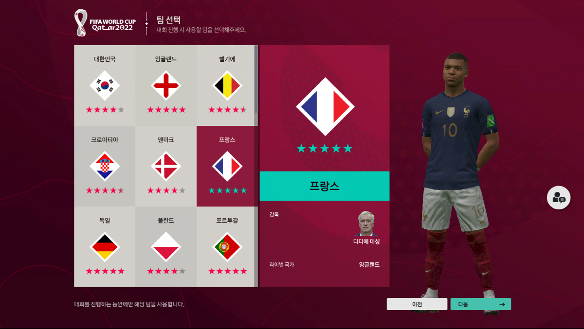 이에 따르면 역시 초박빙으로 나타났다. 프랑스는 이번 대회 5골 2도움을 기록 중인 킬리안 음바페, 후방을 든든하게 지키는 라파엘 바란, 테오 에르난데스, 그리고 골키퍼 위고 요리스를 기용할 시 승률이 높아져 안정감 있는 공수 밸런스가 승리에 핵심적인 요인이 될 것으로 전망된다.