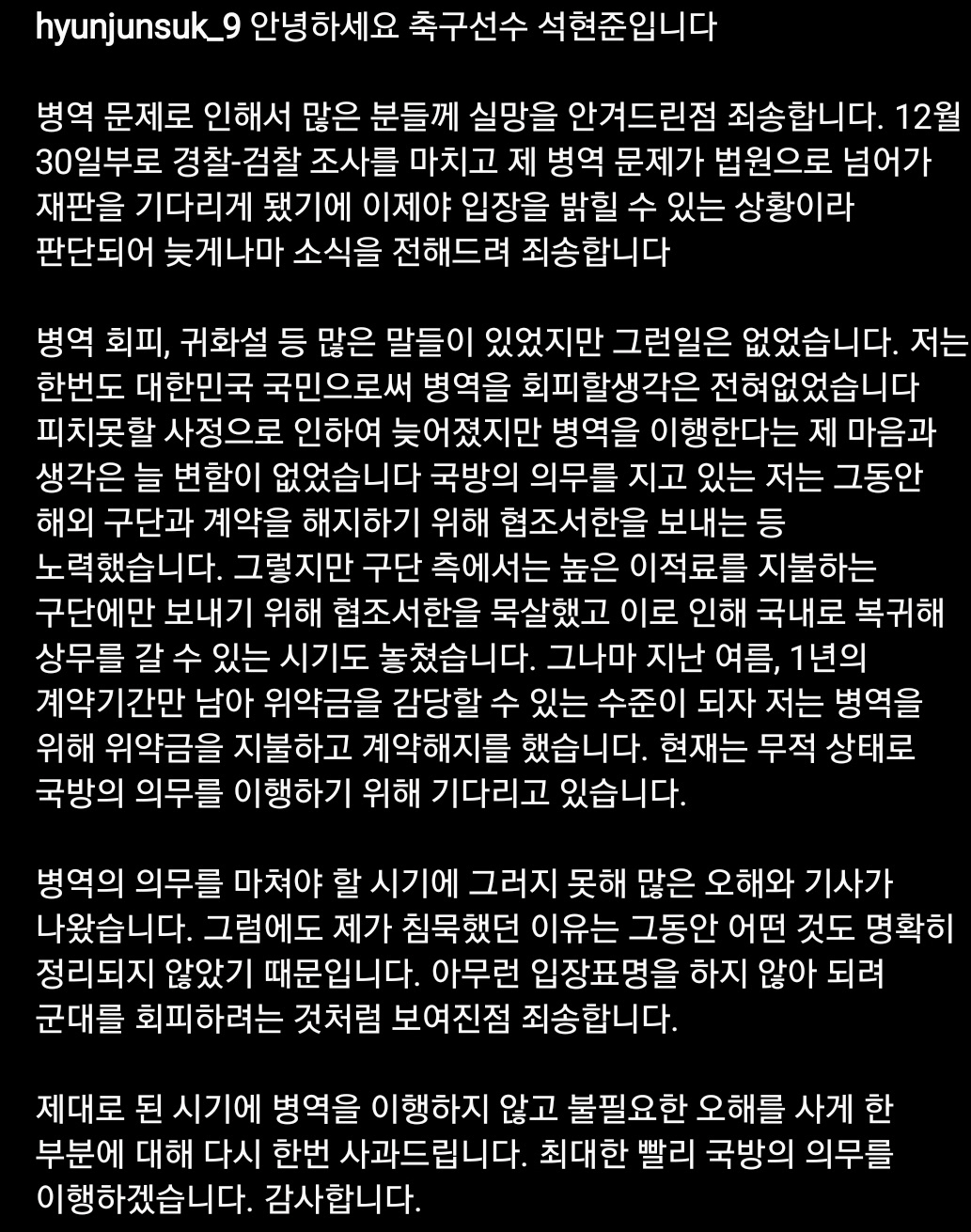 그는 SNS를 통한 입장문에서 '병역 문제로 많은 분들께 실망을 안겨드린 점 죄송하다. 12월 30일부로 경찰-검찰 조사를 마치고 병역 문제가 법원으로 넘어가 재판을 기다리게 됐다. 이제야 입장을 밝힐 수 있는 상황이라 판단했다. 늦게나마 소식을 전해드려 죄송하다. 병역 회피, 귀화설 등 많은 말들이 있었지만 그런 일은 없었다. 한 번도 대한민국 국민으로서 병역을 회피할 생각은 전혀 없었다. 피치못할 사정으로 늦어졌지만 병역을 이행한다는 마음과 생각은 늘 변함이 없었다'고 했다.