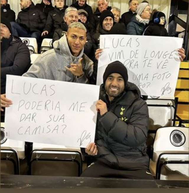 "루카스, 유니폼 좀 줄래?(Lucas, Poderia me dar sua camisa?)"라는 손글씨 팻말을 직접 들고 사진을 찍었다. 경기 후 히샬리송이 이 팻말을 들고 모우라를 깜짝 방문했고, 곧이어 유쾌하고 훈훈한 풍경이 펼쳐졌다. 모우라, 히샬리송이 토트넘 팬들과 함께 "루카스 유니폼 좀 줄래?" "루카스 사진 찍어줄래?" 손글씨를 들고 단체 인증샷을 찍었다. 모우라에게도 팬들에게도 잊지 못할, 따뜻한 이벤트가 됐다.