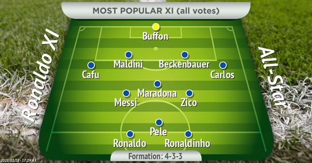 호나우두가 4-3-3을 기반으로 발표한 베스트 11은 부폰(골키퍼)-카를로스 베켄바우어 말디니 카푸(수비)-지코 마라도나 메시(미드필더)-호나우지뉴 펠레 호나우두(공격)로 구성돼 있다. 통산 700골 이상의 골을 넣고, 5번의 발롱도르를 따낸 호날두가 들어갈 틈이 없어 보인다.