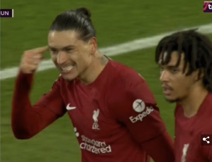[스포츠조선 김가을 기자]다윈 누녜스(리버풀)의 세리머니가 화제다. 마커스 래시포드(맨유)의 세리머니를 모방해 조롱한 것 아니냐는 의견이다.