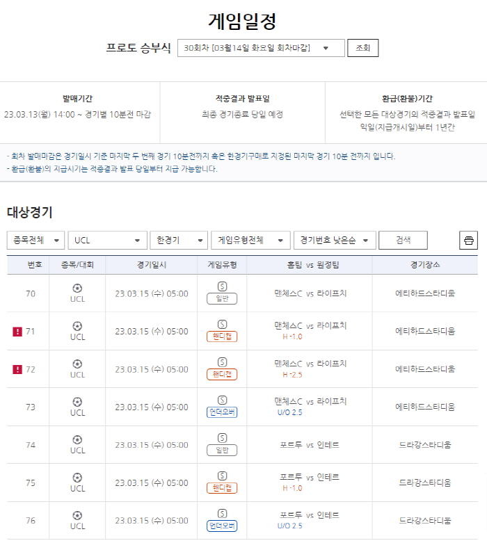 국민체육진흥공단이 발행하는 체육진흥투표권 스포츠토토의 수탁사업자 스포츠토토 코리아가 15일 오전 5시에 각각 에티하드 스타디움과 드라강 스타디움에서 열리는 2022~2023시즌 UEFA 챔피언스리그 16강 2차전 맨체스터시티(홈)-라이프치히(원정), 포르투(홈)-인테르(원정)전을 대상으로 하는 프로토 승부식 30회차 '한경기 구매' 게임이 14일 마감을 앞두고 있다고 밝혔다.