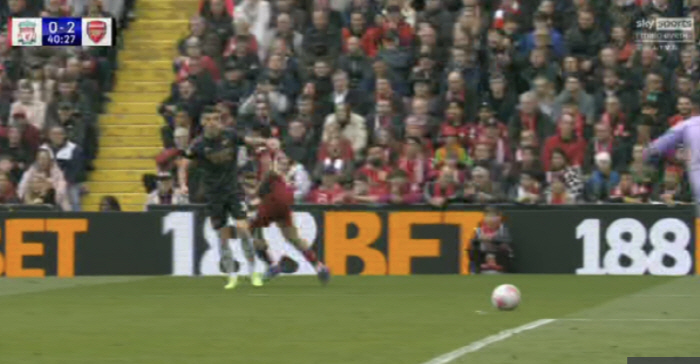 웃지 못할 장면이 있었다. 아스널이 2-0으로 앞서던 전반 40분이었다. 샤카가 리버풀의 이브라히마 코나테와 볼 다툼을 하는 과정이었다. 샤카는 코나테의 거친 압박에 쓰러졌다. 하지만 심판의 파울 휘슬은 없었다. 그는 다시 일어나 당시 공을 잡고 있던 리버풀의 트렌트 알렉산더-아놀드에게 돌진했다.