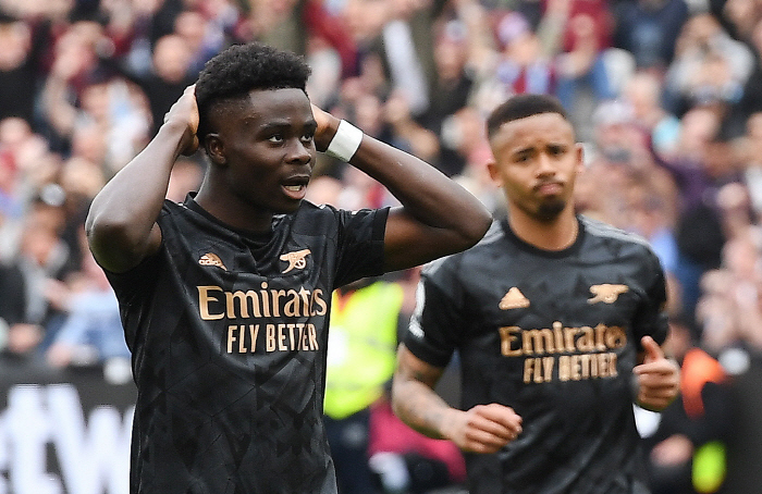 아스널은 16일(한국시각), 영국 런던스타디움에서 열린 잉글랜드 프리미어리그(EPL) 31라운드 웨스트햄전에서 전반 7분 가브리엘 제주스, 전반 10분 마르틴 외데가르드가 연속골을 터뜨리며 2-0으로 앞서가다 전반 33분 벤라마에게 페널티킥 만회골, 후반 9분 자로드 보웬에게 동점골을 내주며 2대2로 비겼다. 부카요 사카의 페널티킥 실축이 뼈아팠다. 성공했다면 3-1로 앞서나갈 수 있었다. 19년 만의 프리미어리그 우승을 노리는 아스널에 빨간 불이 켜졌다. 선두 아스널(승점 74)은 7연승 뒤 리버풀, 웨스트햄전에서 잇달아 다잡은 승리를 놓쳤다. 똑같이 전반 이른 시간 2골을 넣은 후 2골을 내주며 2대2로 비겼다. 시즌 7경기를 남겨두고 1경기 덜 치른 2위 맨시티(승점 70)와의 승점 차가 4점이 됐다. 자칫 삐끗하면 얼마든지 뒤집어질 수 있는 차이다. 맨시티는 올시즌 리그 32골을 기록한 괴물 엘링 홀란의 미친 활약에 힘입어 6연승을 질주하고 있다.