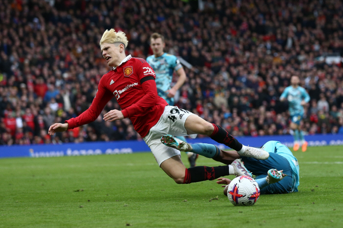 가르나초는 지난달 12일 사우샘프턴전에서 다쳤다. 0-0으로 팽팽하던 후반 35분 아찔한 장면이 벌어졌다. 가르나초가 상대 수비수 카일 워커 피터스에게 거친 태클을 당했다. 가르나초는 후반 막판 프레드와 교체돼 벤치로 물러났다. 경기 뒤에는 목발을 짚은 모습이 포착됐다. 보호대도 착용한 모습이었다.