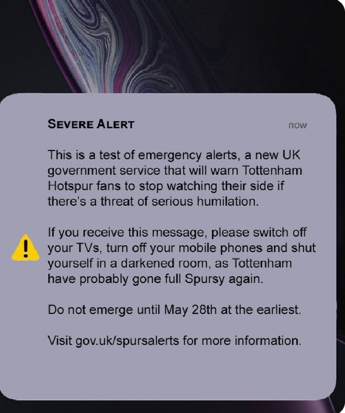 이 테스트 재난 문자에 토트넘의 '재난 상황'을 담아냈다. '심각한 경보'라는 제하에 '긴급 경보 테스트. 영국 정부의 새로운 서비스입니다. 토트넘 홋스퍼 팬들은 심각한 수치심이 우려되는 토트넘 경기 시청을 중단하시길 바랍니다. 이 메시지를 받은 즉시 TV, 휴대폰 전원을 끄시고 어두운 방으로 신속히 대피하시길 바랍니다. 토트넘이 또다시 완전 토트넘스러운 일을 벌일 수 있으니 5월28일(리그 마지막 경기)까지 나타나지 마세요. 더 많은 정보가 필요한 경우 gov.uk/spursalerts(토트넘 경보) 사이트를 방문해주세요'라는 패러디 문자 메시지를 퍼나르며 토트넘의 웃픈 상황을 공유했다.