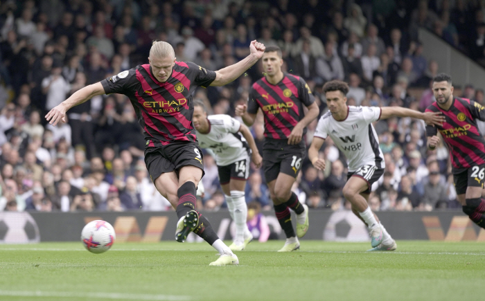 홀란은 지난달 30일 영국 런던 크라벤 코티지에서 열린 풀럼과 2022~2023시즌 잉글랜드프리미어리그(EPL) 34라운드에서 훌리안 알바레즈가 얻어낸 페널티를 전반 3분 선제골로 연결했다.