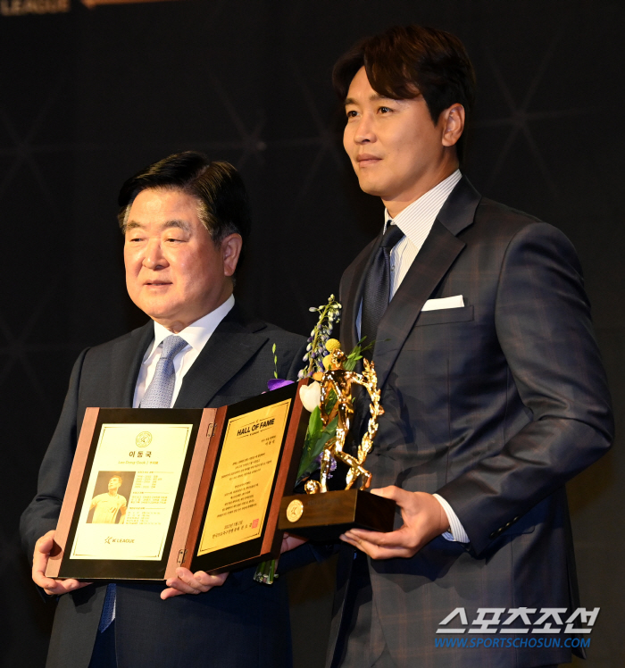 이동국은 "너무 감사하다. 선수로 받는 마지막 상일 것 같아서 길게 이야기하겠다. 감사할 분들이 많다. 축구 인생에서 32년을 선수 생활을 했다. 옆에서 뒤에서 서포터를 해주신 부모님께 감사 인사를 드리고 싶다. 상도 많이 탔는데 부모님 초대는 이번이 처음이다. 마지막이다. 고생 많으셨고 죄송하고 감사하다는 이야기 하고 싶다. 축구 시작하면 국가대표 될 것이라는 초등학교 감독님, 당연히 되는 줄 알았는데 스카우트 할때마다 그 이야기 하셨더라. 프로로 진출할 당시 자신감을 넣어준 김경호 감독님께 감사드리고 싶다. 포항에서 태어나서 선수 생활을 했지만, 이 상을 타게된 것은 전북에서의 활약 덕분이다. 다시 한번 선수 생활을 하면서 이 자리에 오르게 해주신 최강희 감독께 감사인사드리고 싶다. 전북이 상당히 안좋은 상황이다. 선수들, 팬들, 코칭스태프, 지원스태프 모두 힘을 모아서 다시 한번 올라가는 기회가 됐으면 좋겠다. 영광의 자리에 함께 한 대박 패밀리가 지원해준 덕분이다. 시안이가 축구에 빠져 있다. 선수 생활은 기억 못하고 유투브로만 보고 있다. 아빠가 프로선수로 성공하고 명예전당에 헌액됐다는 말을 자랑스럽게 할 수 있는 날이 와서 기쁘다"고 소감을 전했다.