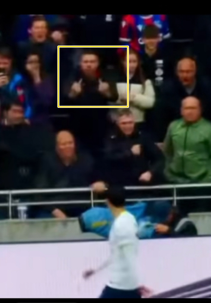 그러나 더 아팠던 장면은 교체 직후였다. 후반 종료 직전 시간지연을 막기 위한 주심의 지시에 따라 손흥민은 벤치 반대편에서 관중석을 지나 걸어나왔다. 동선상 크리스탈팰리스 '원정석' 앞을 지나야 했고, 홈 팬들의 '나이스원, 쏘니!'응원가와 기립박수가 쏟아지는 가운데, 패배 직전의 열받은 크리스탈 팬들은 손흥민에게 야유를 퍼부으며 화풀이 했다. 일부 극렬 서포터들이 눈에 손을 가져가며 눈을 찢는 제스처, 가운데 손가락을 들어올리는 폭력적 제스처 등 명백한 인종차별적 행위를 하는 모습이 포착됐다. 손흥민은 고개 숙이거나 외면하지 않고 이들을 직시했다. 말없이 이들의 행위를 끝까지 응시하는 모습으로 맞대응했다. 매번 잊을 만하면 반복되는 어이없는 인종차별적 행위에 '픽' 실소하는 듯한 모습도 잡혔다. 이 장면은 경기 후 팬들의 직캠과 중계화면 캡처 등을 통해 유튜브, 소셜미디어로 퍼져나갔고, 경기 종료 후 손흥민이 구단 안전 관련 관계자를 불러 귀엣말로 뭔가를 알리는 듯한 모습도 함께 포착됐다. 손흥민이 해당 사건을 인지하고 구단에 알리는 모습같다는 추측이다. 일부 팬들은 직접 찍은 인종차별 영상을 SNS 태그 등을 통해 구단에 제보하고, 각 매체에 DM을 보내며 인종차별 행위에 대한 구단 및 리그 차원의 적극 대응을 촉구하고 있다.