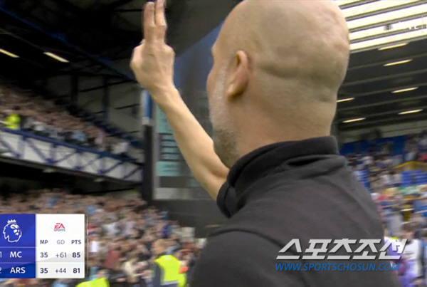 [스포츠조선 윤진만 기자]펩 과르디올라 맨시티 감독이 에버턴을 대파한 뒤 맨시티팬을 향해 손가락으로 숫자 2를 만들었다. 우승까지 단 2승을 남겨뒀다는 자신감 넘치는 메시지다.