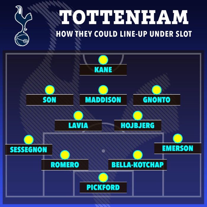 슬롯 감독이 선호하는 4-2-3-1 시스템에서 케인은 원톱, 손흥민 왼쪽 날개에 포진한다. 손흥민 옆 중앙에는 제임스 메디슨이 선다. 메디슨은 강등 위기에 놓인 레스터시티의 올 시즌 결별할 것으로 보인다.