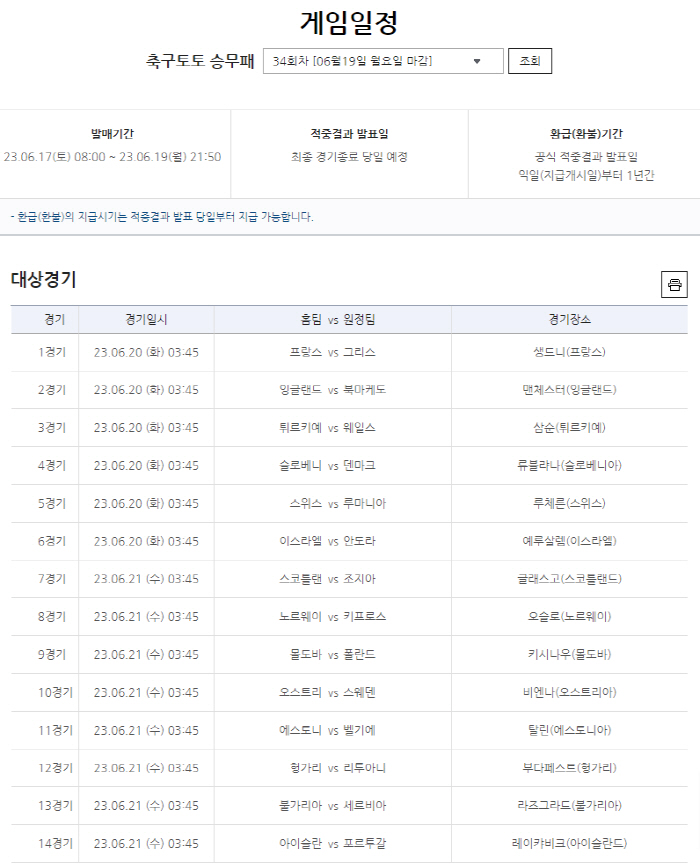 34회차서에도 유로 2024 조별예선 14경기를 대상으로 게임이 진행된다. 이번 회차에는유럽 강팀들인 프랑스, 잉글랜드, 웨일스, 스위스, 벨기에, 포르투갈 등의 경기가 포함됐지만, 현재 조별예선에서 많은 이변이 펼쳐지고 있기 때문에 신중한 결과 예측이 요구되는 게임이다.