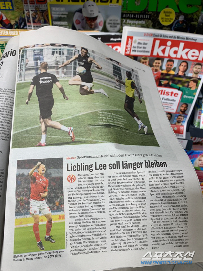100년 넘는 역사를 자랑하는 독일 최대 축구전문지 '키커'가 마인츠 핵심 미드필더 이재성의 재계약 가능성이 크다고 전망했다. '키커'는 주 2회, 월요일과 목요일에 종이 신문을 발간한다. 이재성의 향후 거취에 관한 보도는 월요일자에 큼지막히 실렸다. 이재성이 마인츠의 핵심 선수라는 걸 방증한다. 이재성은 2022~2023시즌 분데스리가 올해의 팀 후보 40인에 당당히 이름을 올렸다.