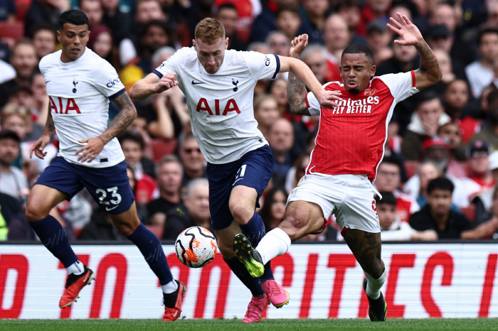 토트넘은 24일 오후 영국 런던 에미레이트 스타디움에서 열리고 있는 아스널과의 2023~2024시즌 잉글랜드 프리미어리그(EPL) 6라운드 경기에서 전반을 1-1로 비긴 채 마쳤다.