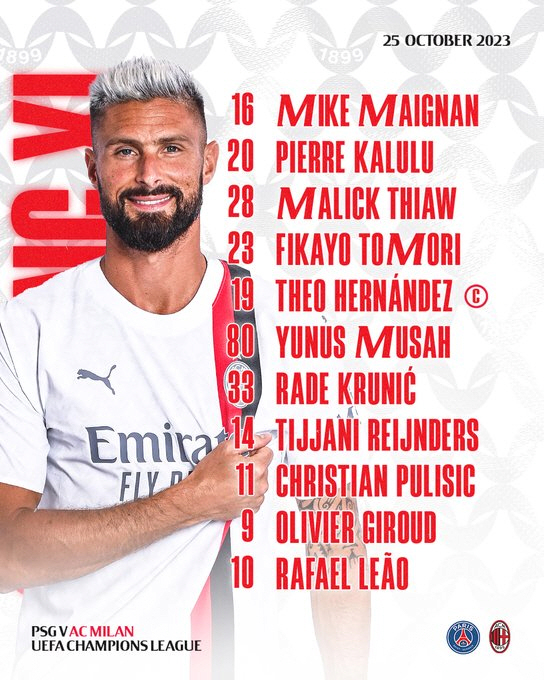 AC밀란 역시 4-3-3 카드를 내세웠다. 하파엘 레앙-올리비에 지루-크리스찬 풀리식이 스리톱을 구성했다. 티자니 레인더스, 라데 크루니치, 유누스 무사가 중원에 나섰다. 테오 에르난데스-피카요 토모리-말릭 치아우-피에르 칼룰루가 수비를 구성했다. 마이크 메냥이 골키퍼 장갑을 꼈다.