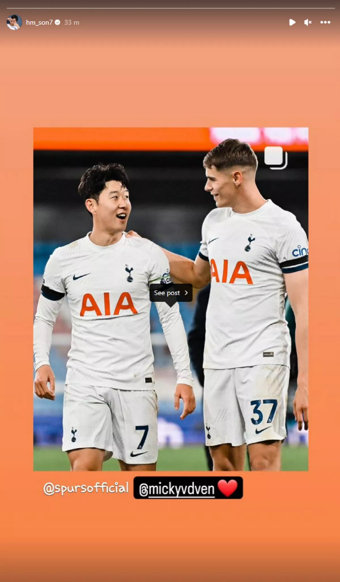 손흥민은 이날 맹활약을 펼쳤으나 존재감이 묻힌 중앙 수비수 미키 반더벤을 기억했다. 풋볼런던은 '손흥민은 주목받지 못했던 반더벤의 경기력을 잊지 않았다. 손흥민은 자신의 SNS에 게시물을 추가했다. 반더벤에게 빨간 하트 이모티콘을 태그해 크리스탈 팰리스전에 대한 감사를 표시했다'라고 조명했다.