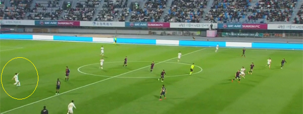 기성용은 하프라인 아래에서 상대 수비 뒷공간을 향해 달려가는 나상호를 향해 특유의 정확한 장거리 패스를 찔렀다. 기성용이 오른발로 깎아찬 공은 빠르게 상대 페널티 박스에 '배달'됐다. 공은 헤더를 시도한 나상호의 머리 위를 지나 그대로 골문 쪽으로 바운드되어 날아갔다. 나상호의 슛에 대비해 골문을 비우고 나온 수원FC 골키퍼 노동건이 부랴부랴 방향을 틀었으나, 때는 늦었다.