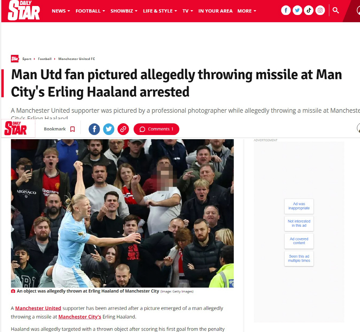 페널티킥이 선언되기까지 비디오판독(VAR)을 거치는 과정에서 최종 판단을 가슴 졸이며 기다리던 맨유 관중석의 흥분지수가 높아졌다. 이런 가운데 홀란드가 골 세리머니를 하며 러닝을 한 곳이 맨유 관중석 앞이었다. 이때 관중석에 있던 한 남성이 홀란드에게 불상의 물체를 던졌다. 당시에는 이 행위가 부각되지 않았으나 한 전문 사진작가가 때마침 포착한 사진이 경기 후 온라인 등을 통해 공개되면서 사건으로 커졌다.