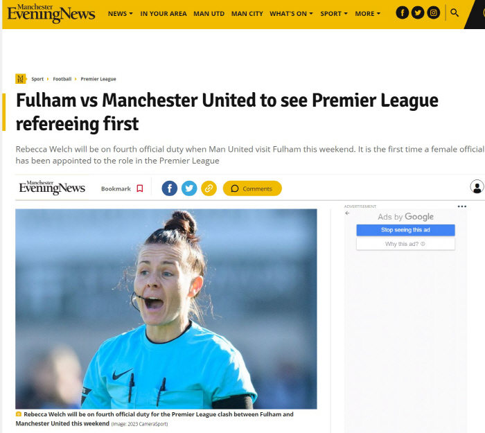 맨체스터 이브닝뉴스 등 영국 매체들에 따르면 4일 오후 9시 30분(이하 한국시각) 킥오프하는 맨유와 풀럼의 경기에서 여성 심판인 레베카 웰치(40)가 대기심(Fourth Official)으로 배정됐다.