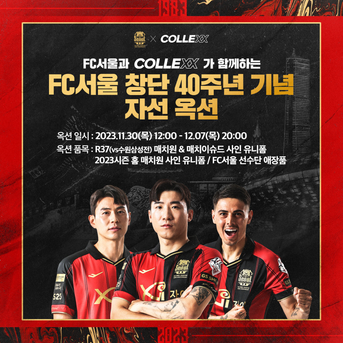 FC서울 창단 40주년 기념 자선 옥션 행사는 30일부터 12월 7일까지 8일 동안 진행되며 참가를 희망하는 팬들은 '컬렉스' 사이트에서 회원 가입 후에 자선 옥션 행사 참여가 가능하다.