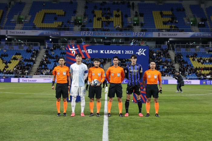 인천축구전용경기장/ K리그1/ 파이널A/ 인천유나이티드 vs 울산현대축구단/ 곽승순 2부심, 울산 김기희, 채상협 대기심, 김종혁 주심, 인천 오반석, 송봉근 1부심/ 심판진/ 양 팀 주장/ 기념 사진/ 사진 정재훈