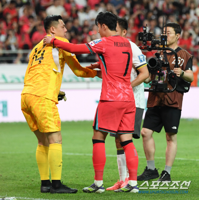 11일 서울월드컵경기장에서 열린 2026 FIFA 북중미 월드컵 2차 예선 대한민국과 중국의 경기. 승리한 대한민국 손흥민이 중국 골키퍼 왕다레이와 인사를 나누고 있다. 상암=박재만 기자 pjm@sportschosun.com/2024.06.11/