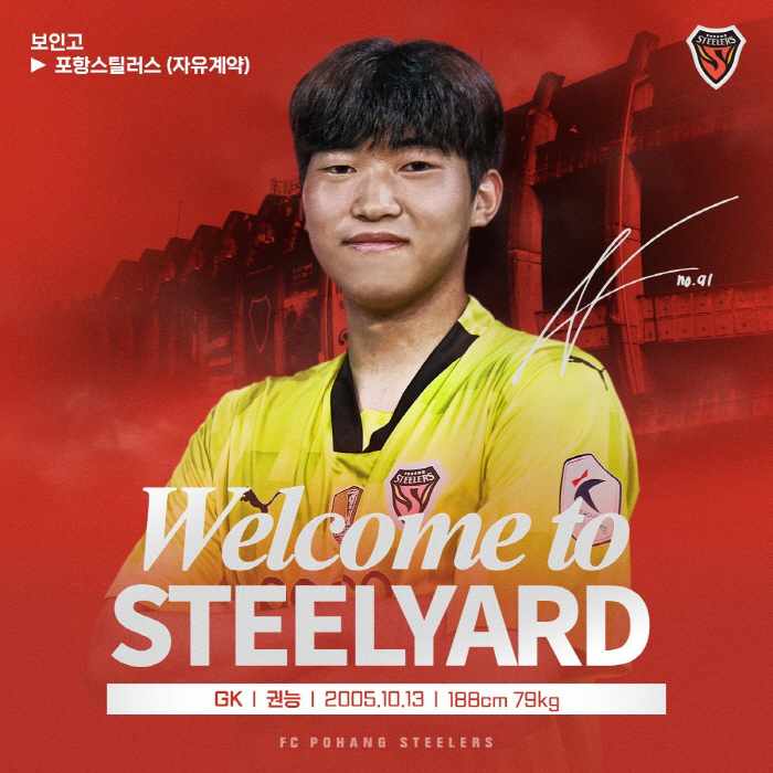 [스포츠조선 한동훈 기자] 포항 스틸러스가 신인 골키퍼 권능(19)과 계약을 마쳤다고 25일 공식 발표했다.