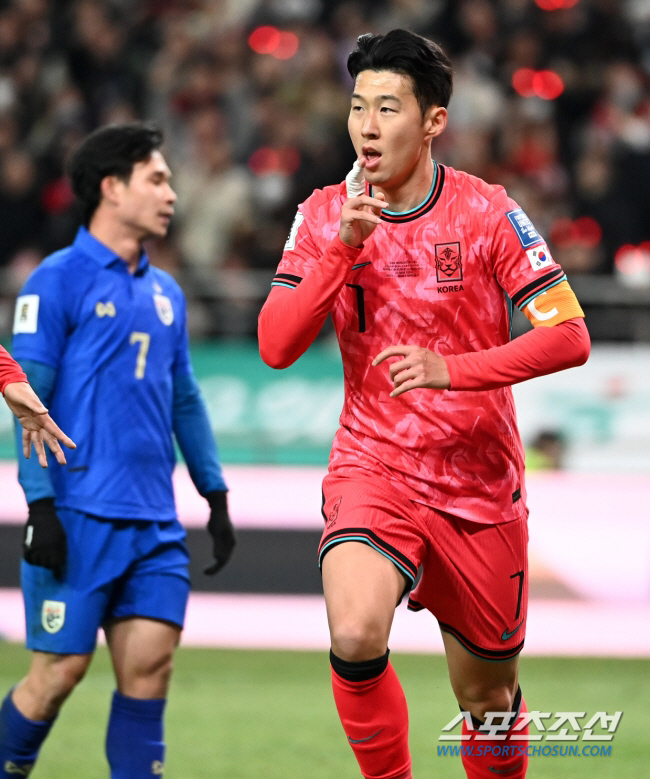 21일 서울월드컵경기장에서 열린 2026 FIFA 북중미 월드컵 2차 예선 대한민국과 태국의 경기, 손흥민이 선제골을 성공한 후 세리머니를 하고 있다. 상암=허상욱 기자wook@sportschosun.com/2024.03.21/