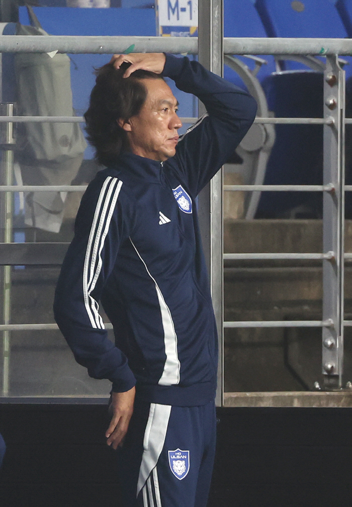 머리 쓸어넘기는 홍명보 감독 (울산=연합뉴스) 김용태 기자 = 10일 울산 문수축구경기장에서 열린 프로축구 하나은행 K리그1 2024 울산 HD와 광주FC의 경기에서 울산 홍명보 감독이 벤치에서 경기를 지켜보고 있다. 2024.7.10