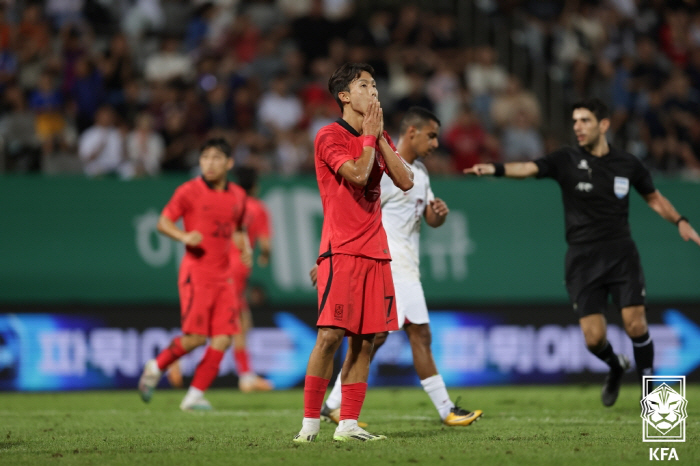 한국은 4-2-3-1 포메이션으로 시작했다. 주민규(울산)가 최전방에 섰고, 황희찬(울버햄튼)-이재성(마인츠)-이강인(PSG)이 2선을 꾸렸다. 황인범(페예노르트)-박용우(알 아인)가 3선에 자리했고, 이명재(울산)-김민재(바이에른 뮌헨)-조유민(샤르자)-설영우(즈베즈다)가 포백을 형성했다. 골문은 조현우(울산)가 지켰다.
