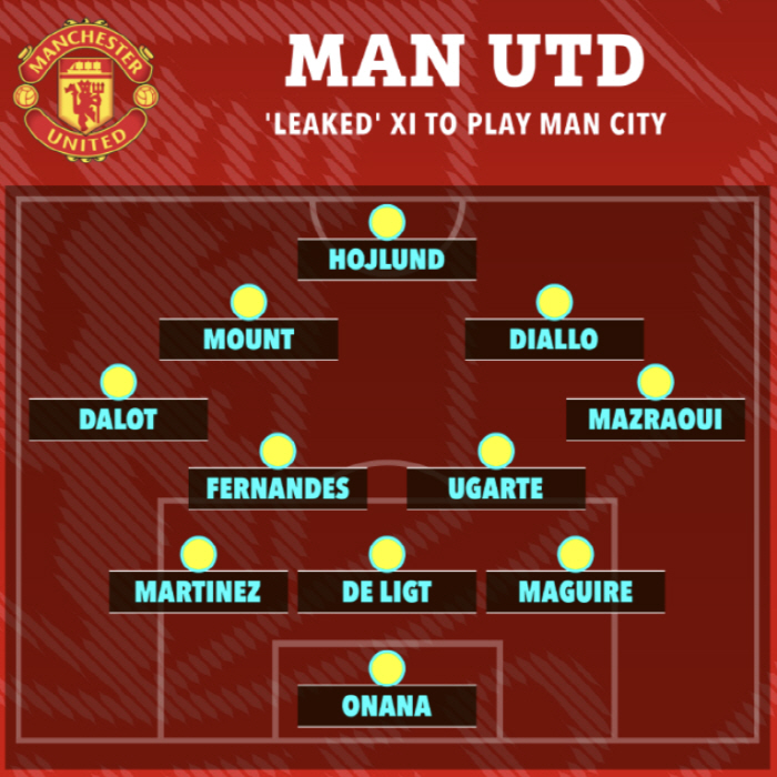 더선은 '유출된 정보에 따르면 맨유는 안드레 오나나-리산드로 마르티네스-마타이스 데 리흐트-해리 매과이어-브루노 페르난데스-마누엘 우가르테-디오고 달롯-누사이르 마즈라위-메이슨 마운트-아마드 디알로-라스무스 호일룬이 선발로 나설 것으로 보인다'고 했다.