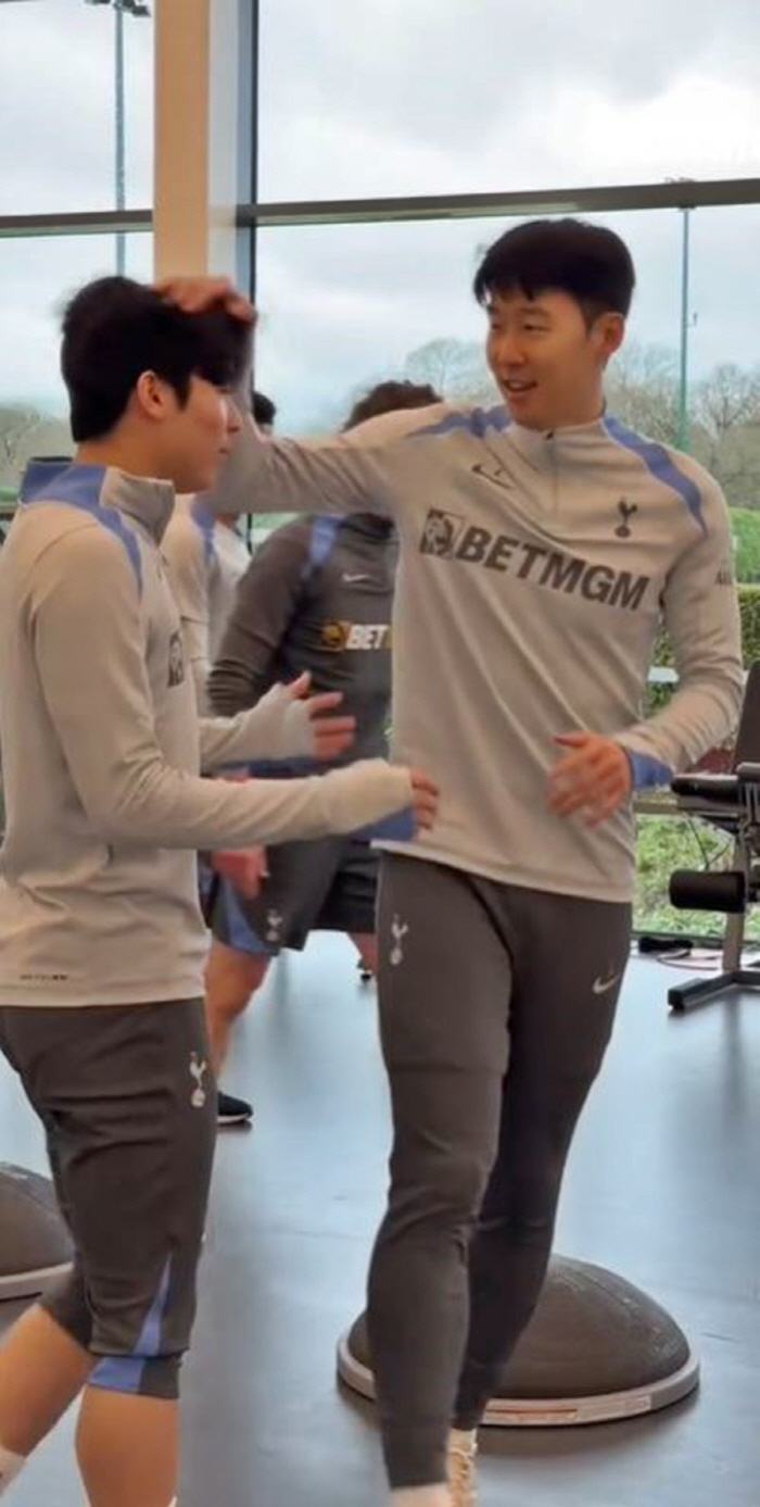토트넘은 7일(한국시각) 공식 소셜네트워크서비스(SNS)에 토트넘 실내 훈련장에서 손흥민과 양민혁이 짝 맞춰 몸을 풀고 있는 영상을 찍어올렸다.