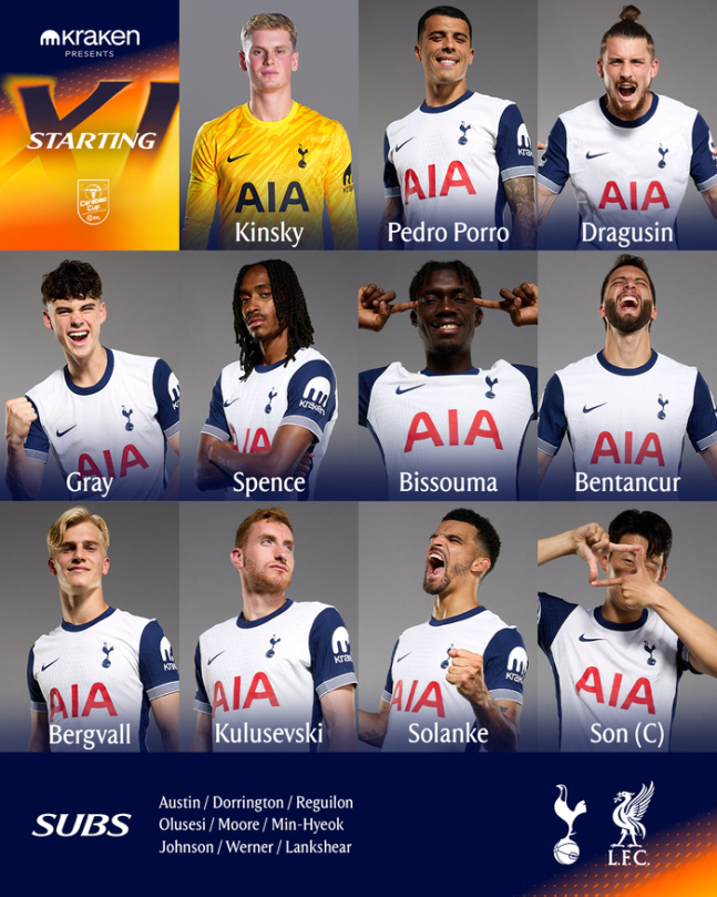 토트넘은 4-3-3 카드를 꺼냈다. 손흥민, 도미닉 솔랑케, 데얀 클루셉스키가 스리톱을 꾸렸다. 허리에는 루카스 베리발과 이브 비수마, 로드리고 벤탕쿠르가 출전했다. 포백은 제드 스펜스-라두 드라구신-아치 그래이-페드로 포로가 포백을 이뤘다. 골문은 인토난 킨스키가 지켰다.