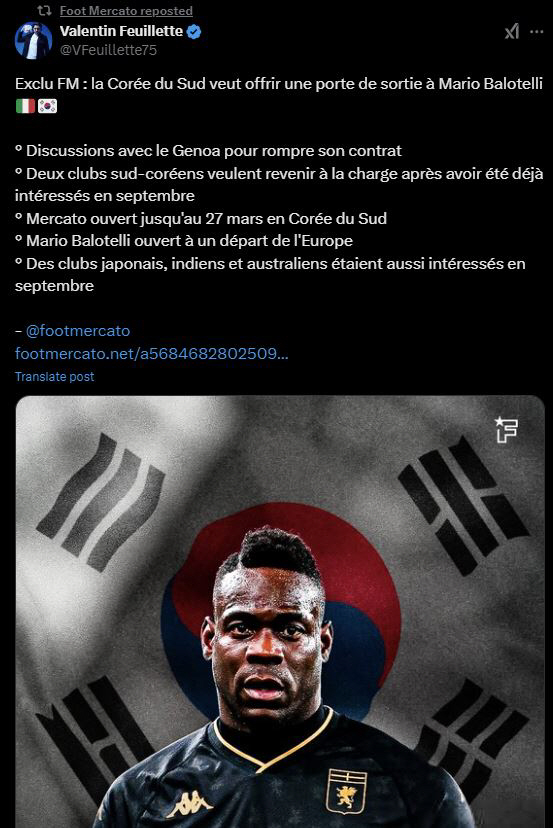 프랑스 매체 풋 메르카토가 29일(한국시각) 발로텔리의 깜짝 한국행 가능성을 언급했다. 심지어 '마리오 발로텔리를 구하러 온 한국'이라는 타이틀을 달았다.