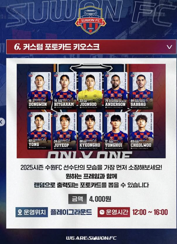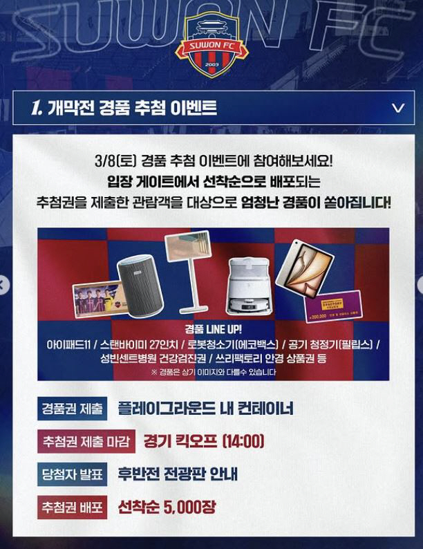 수원FC 구단도 팬들의 기다림에 부응하고자 경기장 안팎에 다채로운 이벤트를 준비했다. 애플 아이패드, LG스탠바이미, 에코백스 로봇청소기, 필립스 공기청정기 등 풍성한 경품 추첨 이벤트, 스페이스A 축하공연, 캐슬 스테이지 운영, 선수단 팬 사인회, 피크닉존과 푸드트럭, 커스텀 포토카드 키오스크, 수원FC 포토이즘 부스, 수원FC 포토존, BAMKEL과 함께하는 SNS인증샷 이벤트 등이 마련됐다. 전영지 기자 sky4us@sportschosun.com
