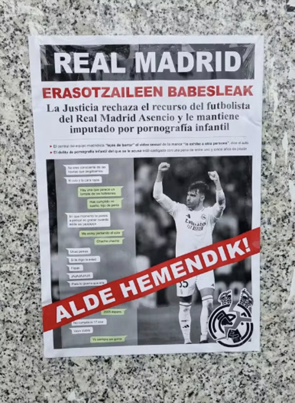 [스포츠조선 윤진만 기자]13일(현지시각) 데포르티보알라베스와 레알마드리드가 격돌한 스페인 데포르티보의 멘디소로트사 경기장 외곽 곳곳에 포스터가 붙었다. 알라베스 홈팬이 제작한 포스터에는 레알마드리드 구단명과 레알 수비수 라울 아센시오 사진, 아센시오가 가담한 것으로 알려진 단톡방 대화 내용 캡쳐본과 함께 '법원은 레알마드리드 축구선수 아센시오의 항소를 기각하고, 그를 아동포르노 혐의로 기소했다'라는 기사 문구가 새겨져있다. 빨간색으로 강조 표시된 '여기서 나가!'라는 메시지는 아센시오 사진 위에 대각선으로 배치했다.