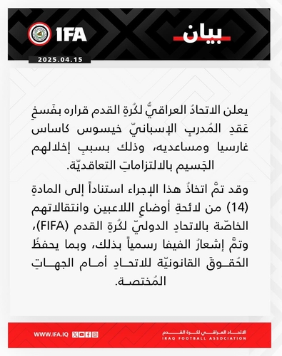 이라크축구협회(IFA)는 15일(한국시간) 성명서를 내고 "카사스 감독과 그의 코치진이 계약 의무를 심각하게 위반해 계약을 해지하기로 결정했다"고 밝혔다.