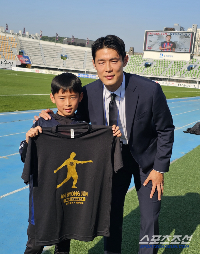 용찬군은 지난해 부산 아이파크 U9 심화반의 일본 오사카 교류 캠프 5경기에서 7골을 터뜨리며 '부전자전' 공격 DNA를 입증한 바 있다. 안병준은 "저도 선수로서 은퇴식을 해주셔서 감사하고, 아들에게도 프로선수들이 뛰는 경기장에서 볼을 찬다는 게 쉽지 않은 기회인데 정말 감사하다. 아들이 앞으로도 그 감사함을 안고 볼을 찼으면 좋겠다"고 바랐다. 아들 용찬군과 꿈나무 선수들을 향한 응원의 한마디도 잊지 않았다. "어린 선수들이 목표를 향해 하루하루 노력해 가면서, 가장 중요한 것은 축구를 사랑하고 즐기는 것이다. 즐기면서 축구했으면 좋겠다"고 말했다. K리그에서의 축구인생, 충분히 즐겼느냐는 질문에 "네, 저는 충분히 즐겼습니다"라며 활짝 웃었다.