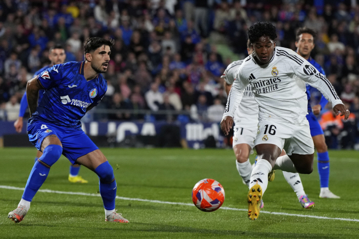 Getafe's Juan Berrocal, left, and Real Madrid's Endrick challenge for the ball during a Spanish La Liga soccer match between Getafe and Real Madrid at the Coliseum Alfonso Perez stadium in Getafe, Spain, Wednesday, April 23, 2025. (AP Photo/Manu Fernandez) <저작권자(c) 연합뉴스, 무단 전재-재배포, AI 학습 및 활용 금지>