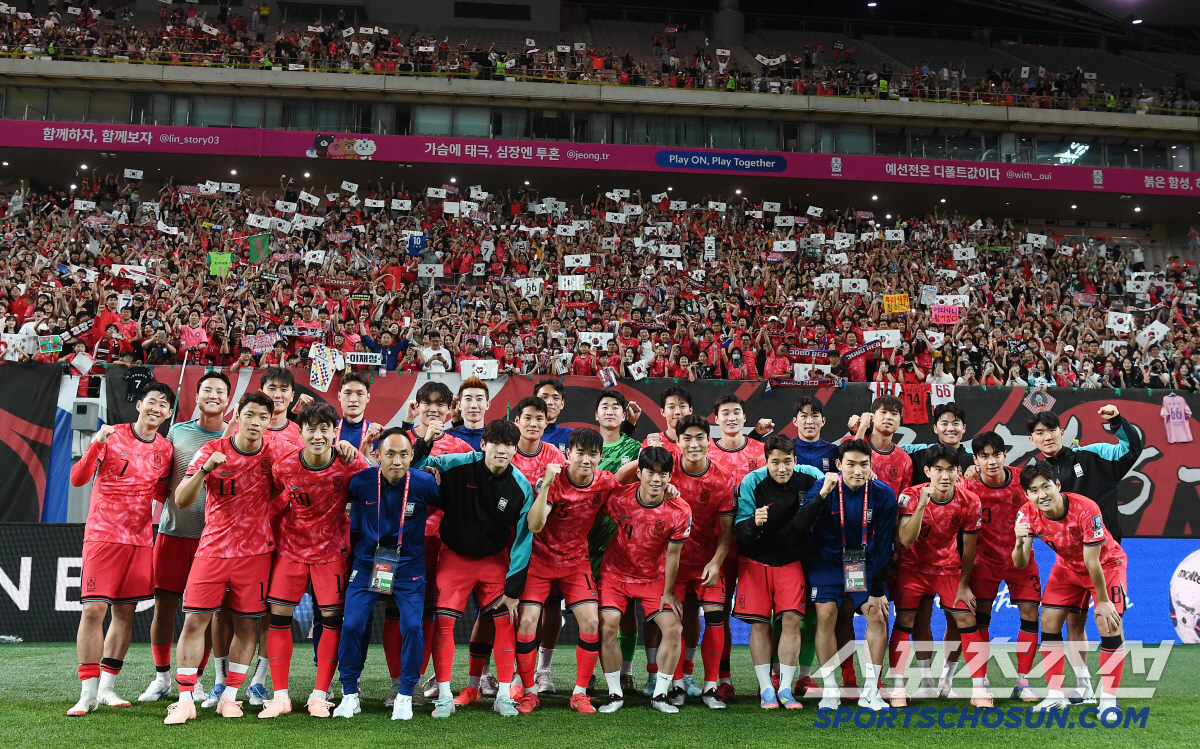 10일 서울월드컵경기장에서 열린 대한민국과 쿠웨이트의 2026년 북중미월드컵 아시아 3차예선 B조 최종전. 대한민국이 4대0 승리를 거둔 후 열린 월드컵 진출 축하행사에서 팬들과 함께 기념 사진을 찍고 있다. 상암=정재근 기자 cjg@sportschosun.com