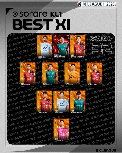 3-4-3 포메이션으로 선정한 K리그1 32라운드 베스트 11에는 세징야(대구), 마사(대전), 이동경(김천·이상 FW), 김승섭(김천), 김봉수(대전), 남태희(제주), 이동준(김천·이상 MF), 김강산(김천), 우주성(대구), 김문환(대전·이상 DF), 김태훈(김천·골키퍼)이 이름을 올렸다.