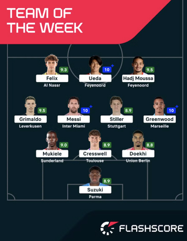우에다와 페예노르트 동료 아니스 하지 무사(9.5점), 크리스티아누 호날두의 알 나스르 공격 파트너 주앙 펠릭스(9.3점)가 이주의 팀 스리톱을 이뤘다. 펠릭스는 알 파테흐와의 사우디 프로리그 5라운드에서 시즌 두 번째 해트트릭을 쏘며 5대1 승리를 이끌었다. 시즌 8골로 프로리그 득점 단독 선두로 올라섰다.