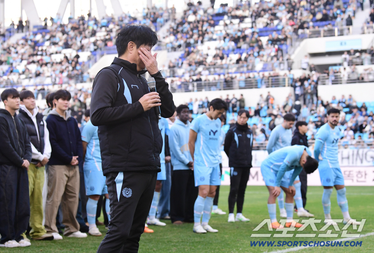 30일 대구IM뱅크파크에서 열린 K리그1 대구FC와 FC안양의 경기. 양 팀은 2-2 무승부를 기록했다. 대구FC는 강등이 확정됐다. 경기 종료 후 팬들 앞에서 눈물 흘리는 대구FC 김병수 감독. 대구=송정헌 기자songs@sportschosun.com