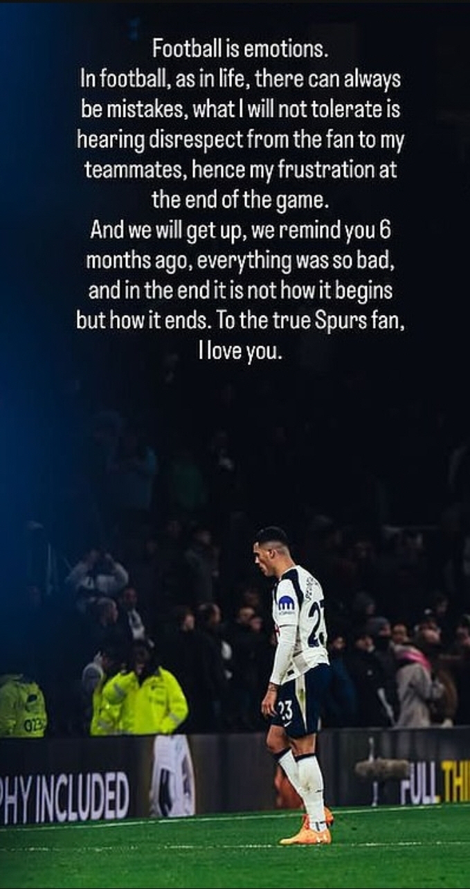 '토트넘 풀백' 페드로 포로가 풀럼전 안방 패배 후 루카스 베리발과의 충돌에 대해 SNS를 통해 직접 해명했다.