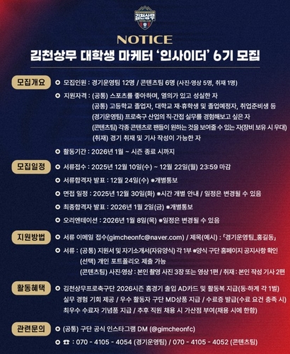 (서울=연합뉴스) 이영호 기자 = 프로축구 K리그1 김천 상무가 대학생 마케터 '인사이더' 6기를 모집한다고 10일 밝혔다.