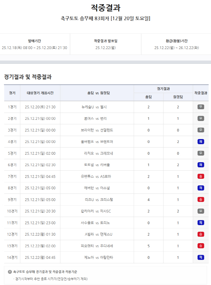 서울올림픽기념국민체육진흥공단(이사장 하형주)이 발행하는 체육진흥투표권 스포츠토토의 수탁사업자 한국스포츠레저가 공식 인터넷 발매 사이트 '베트맨'을 통해 지난 20일부터 22일까지 진행된 잉글랜드 프리미어리그(EPL) 및 이탈리아 세리에A 14경기를 대상으로 실시한 축구토토승무패83회차의 적중결과를 발표했다.