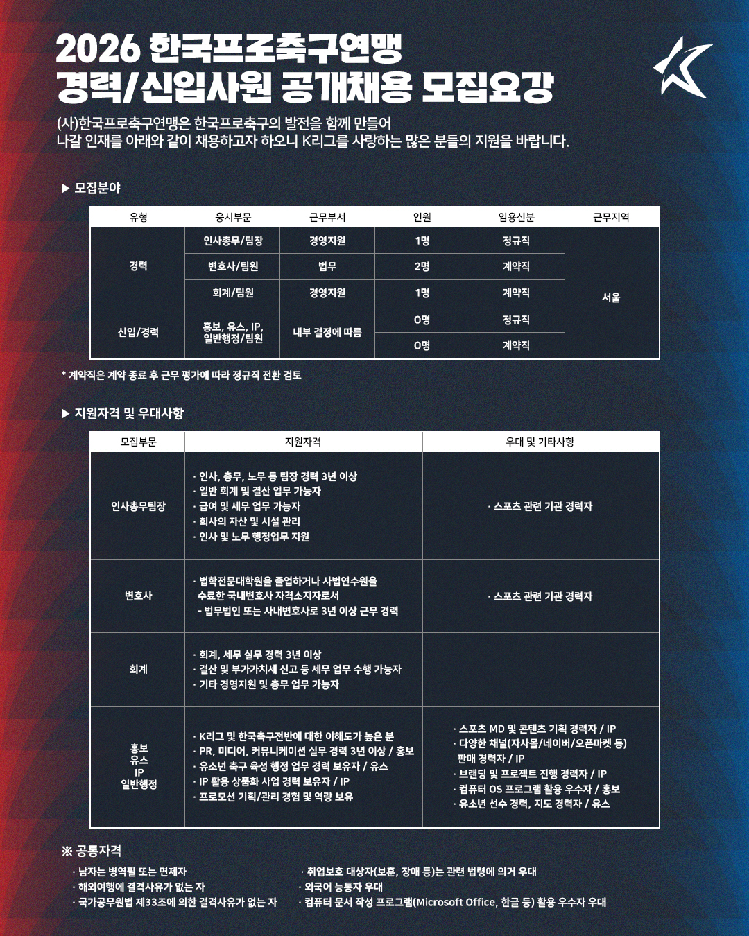 한국프로축구연맹(총재 권오갑)이 신입 및 경력사원을 공개 채용한다. 직무는 인사총무팀장, 변호사, 회계, 홍보, 유스지원, IP사업 및 기타 일반 행정 등이다.