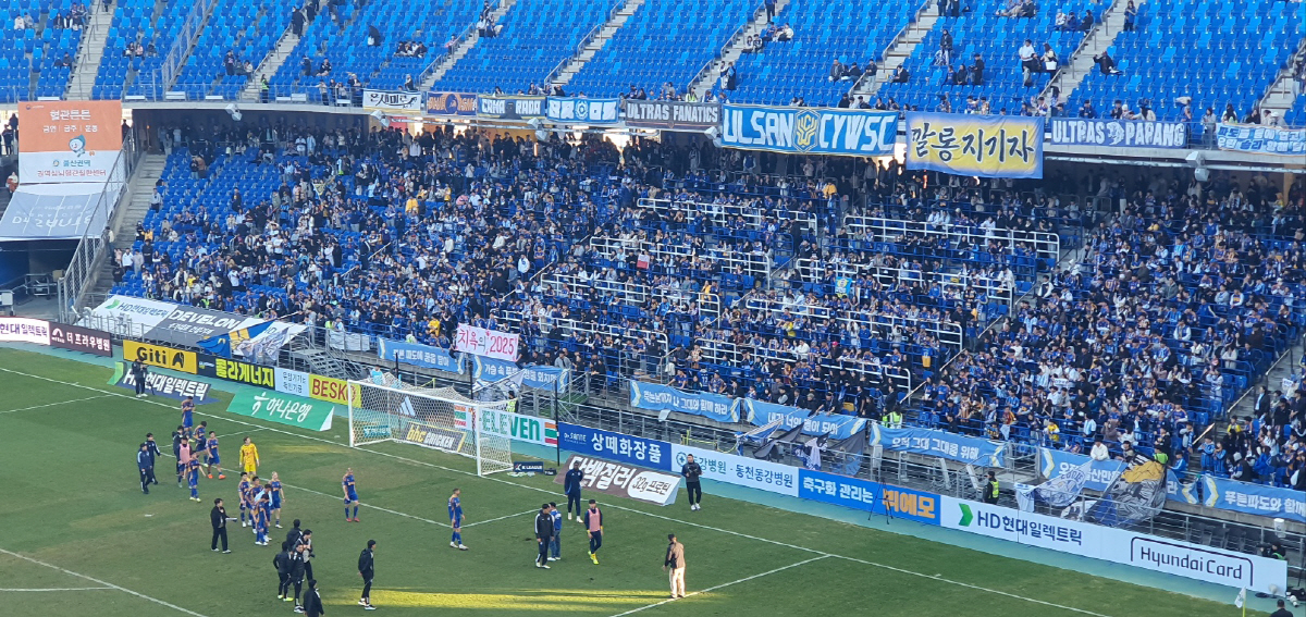 30일 울산문수축구경기장에서 열린 울산HD와 제주 SK FC의 K리그1 2025 경기. 제주가 1대0으로 승리했다. 울산은 패했으나 9위로 잔류를 확정했다. 경기 후 팬들에게 죄송한 마음을 전하는 울산 선수들의 모습. 울산=허상욱 기자wook@sportschosun.com/2025.11.30/